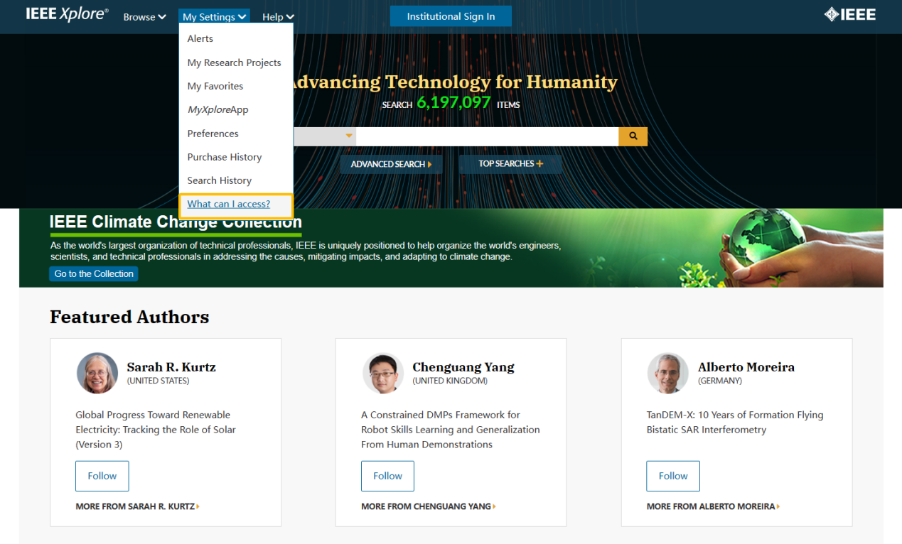 您可以登录IEEE Xplore平台,通过点击平台主页上方My settings,找到“What can I access?”。